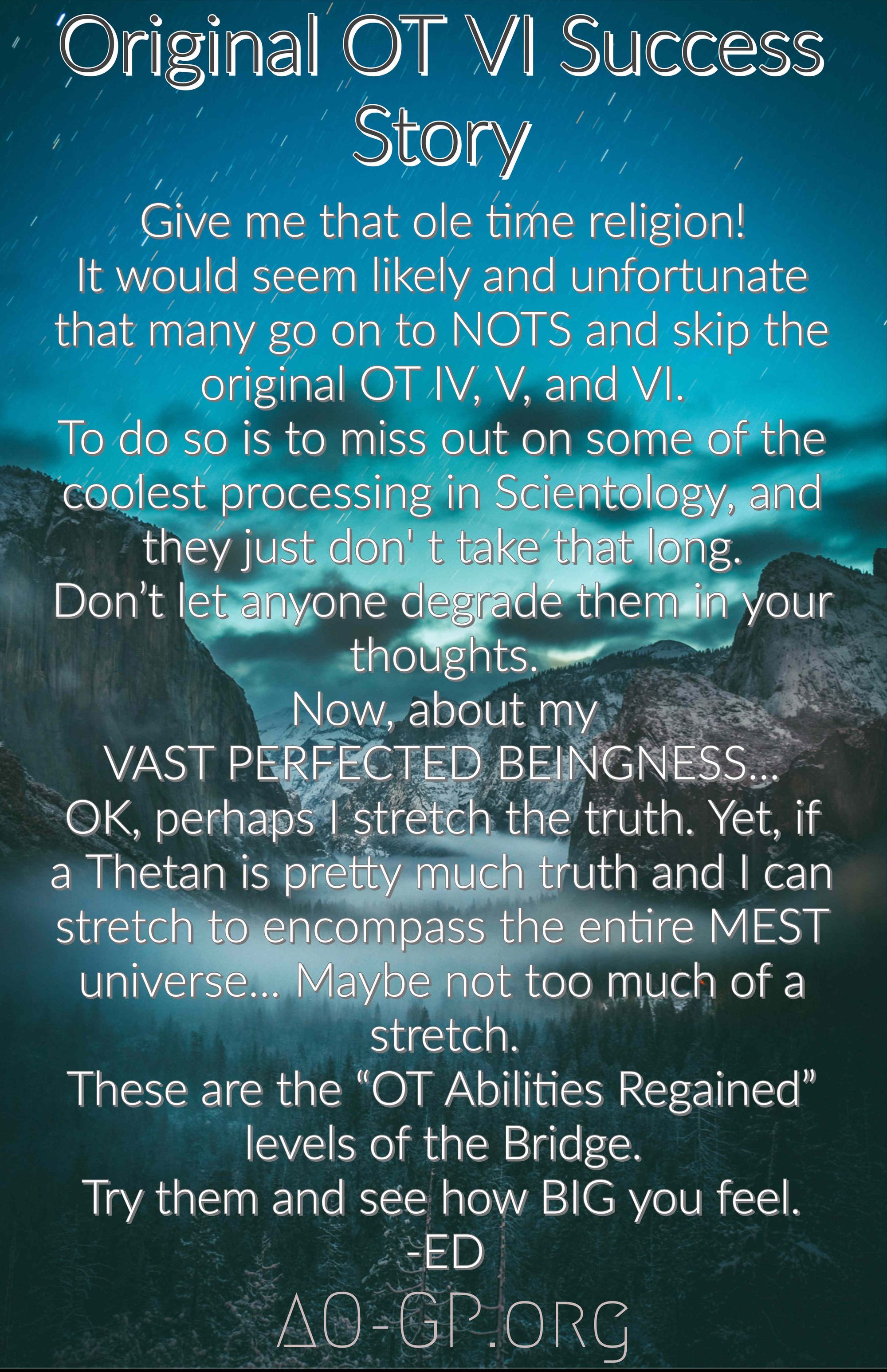 Read full story...The original OT VI End Phenomena is:THE ABILITY TO OPERATE FREELY AS A THETAN EXTERIOR AND TO ACT PANDETERMINEDLY, EXTENDS THE INFLUENCE OF THE THETAN TO THE UNIVERSE OF OTHERS"I feel incredibly...