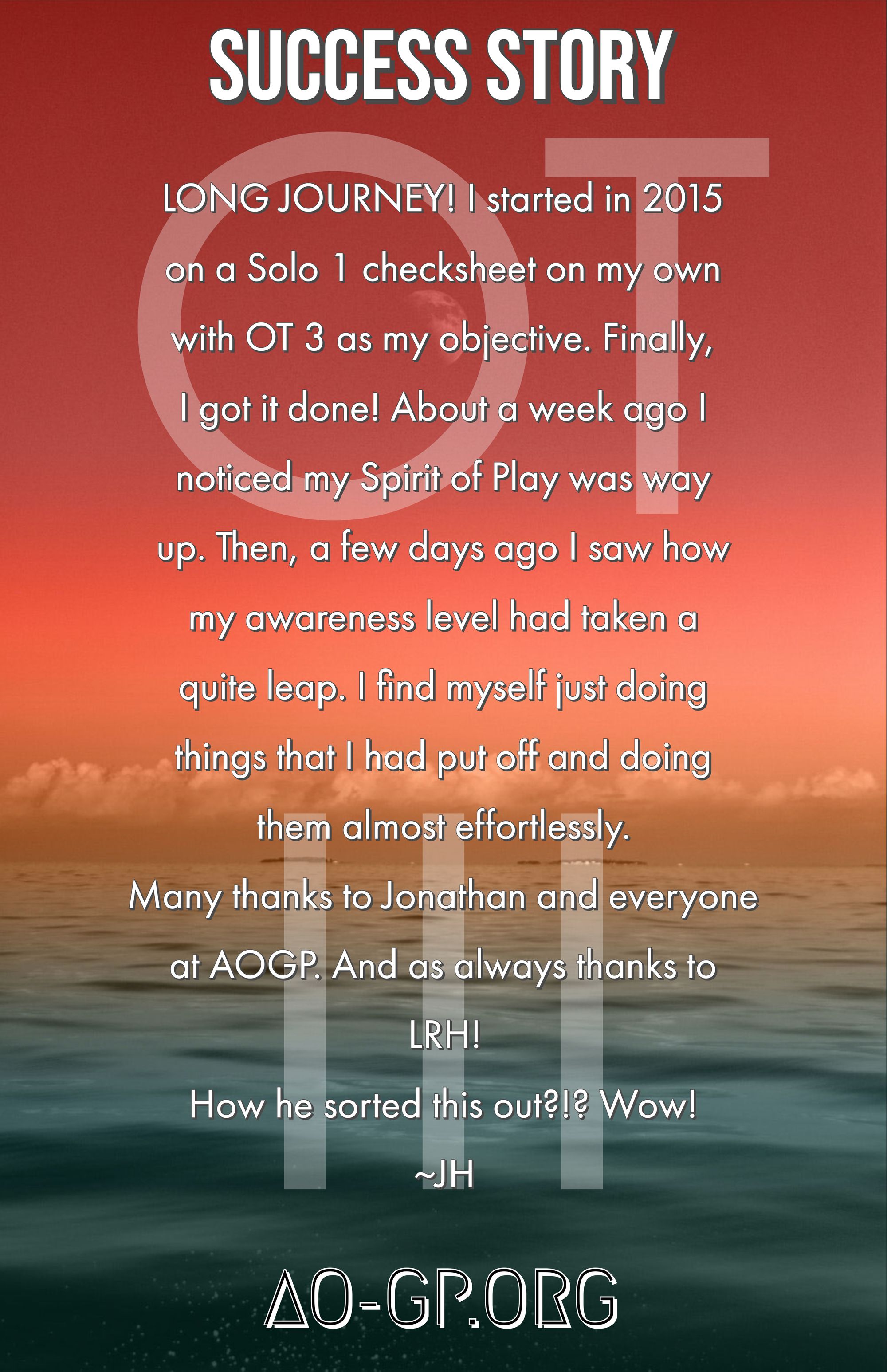 Read full story...Wow, this was a tremendous joy ride. I was keyed out through the whole OT I level. One of my biggest realizations was that I am not the ONLY ONE.There are many thetans out there and I was amazed at...