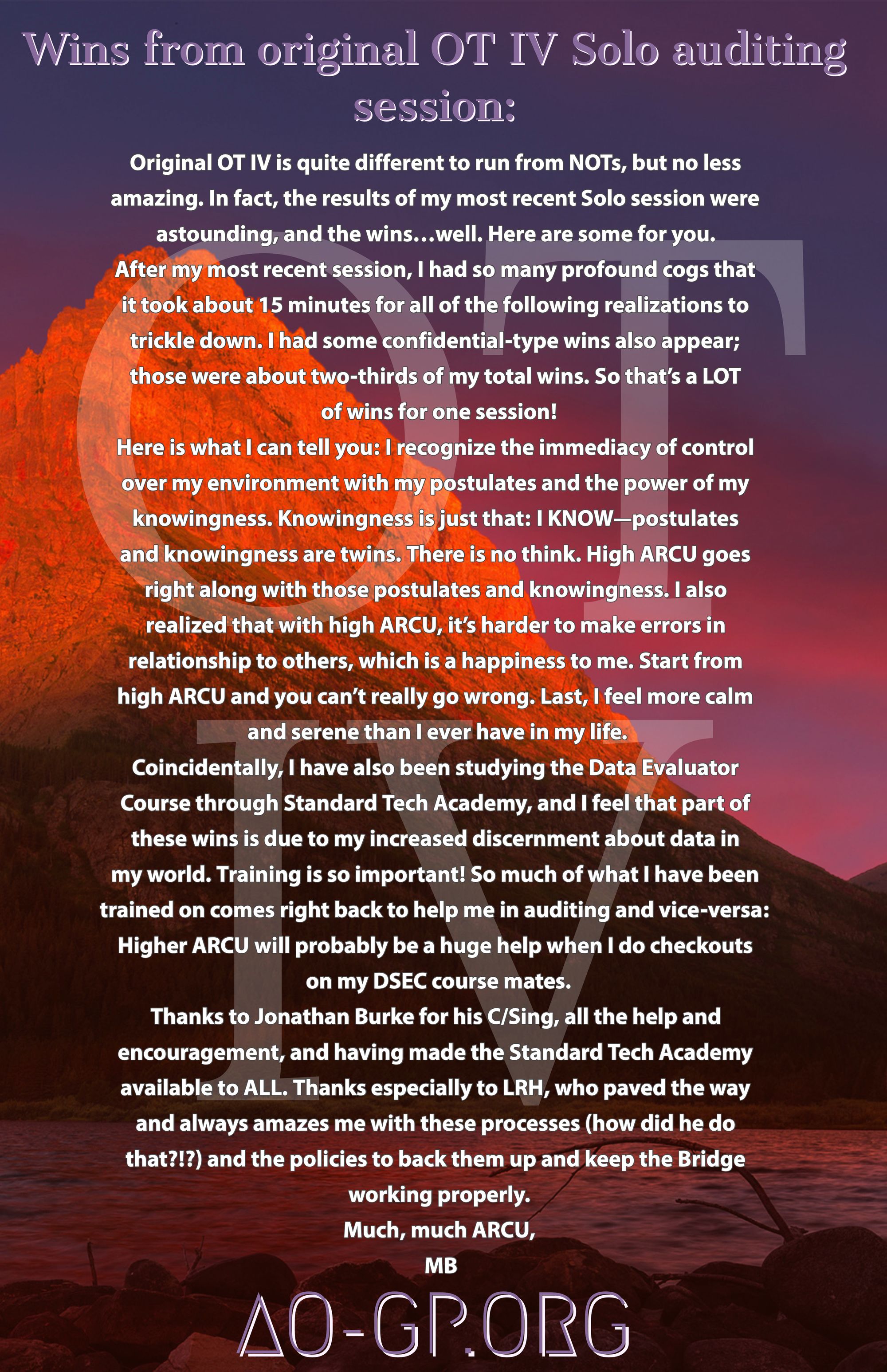Read full story...I was having a few bumps on my Original OT IV Solo Auditing, though on many different levels I am winning. I could feel the case upon me that needed to be handled.This is a very subtle straight A-B...